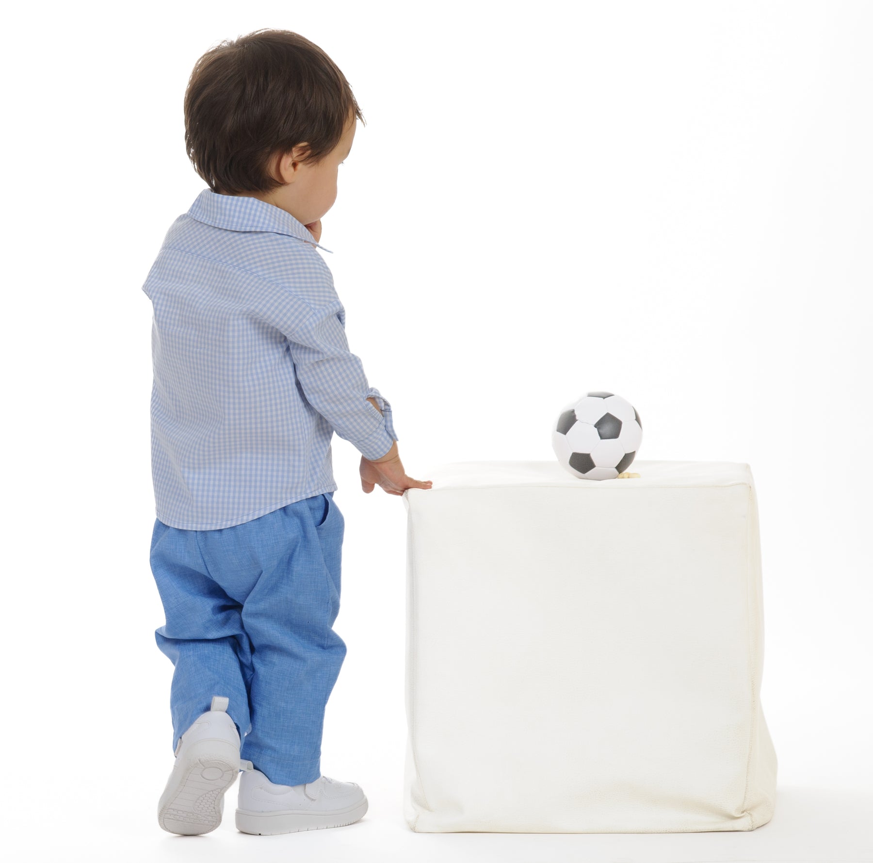 Schnittmuster Hose für Baby und Kinder NOAH - Jungen Größen 68-122, Baby in blauen Hosen und kariertem Hemd mit Fußball