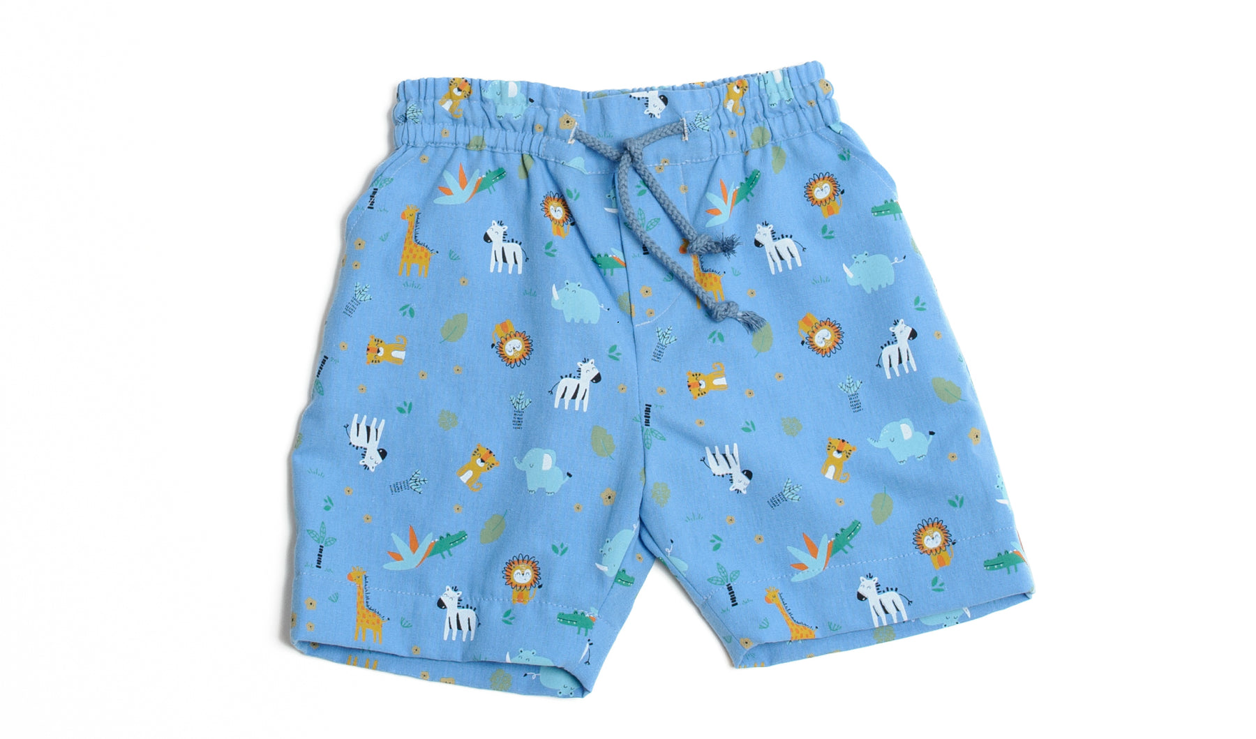Schnittmuster Hose für Baby und Kinder NOAH - lässiger Junge in blauer Sommerkleidung mit Tiermotiven.