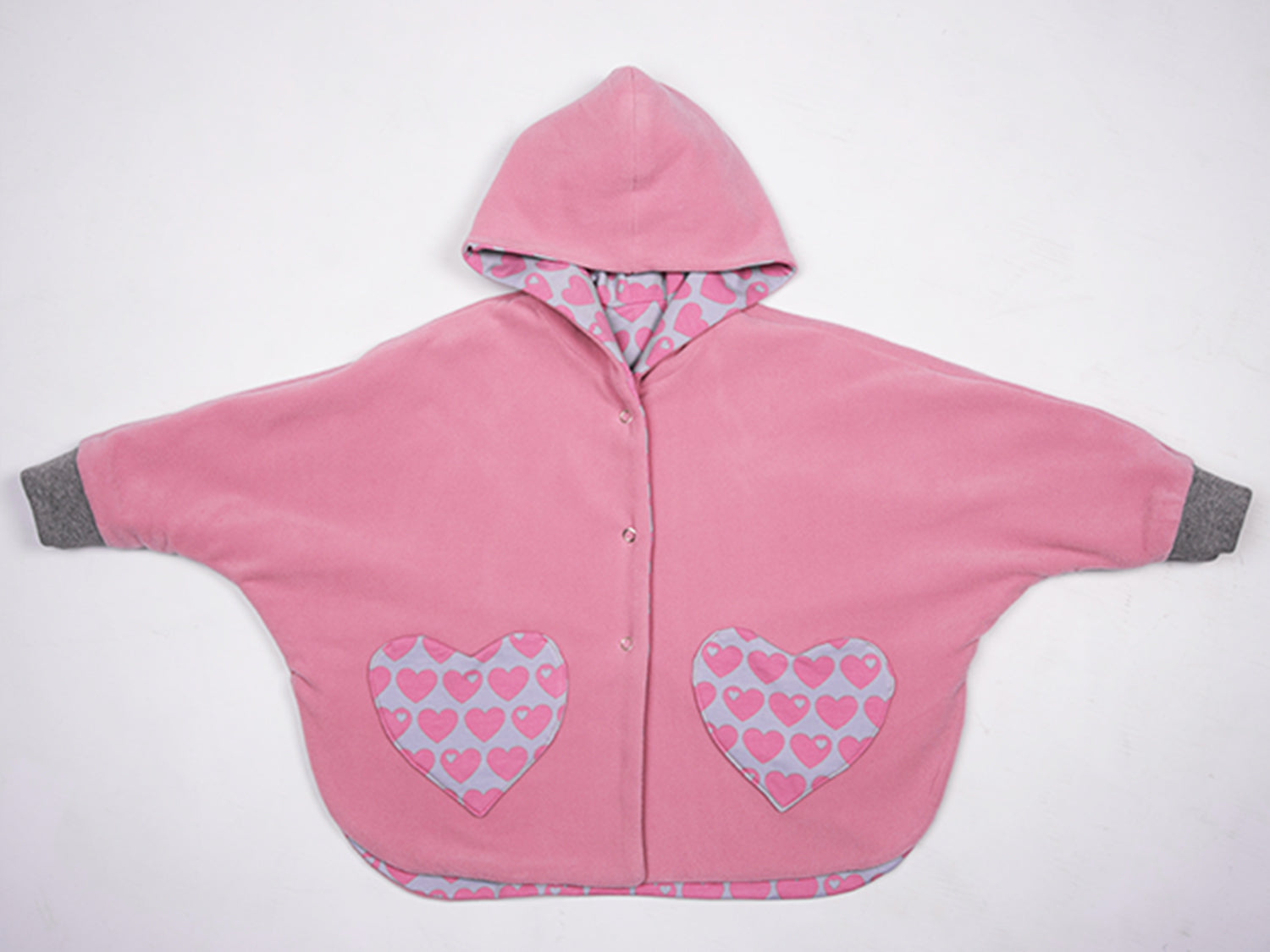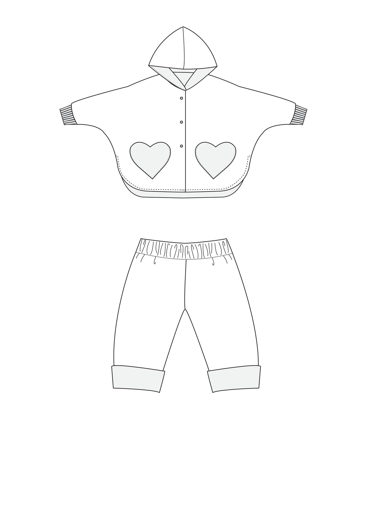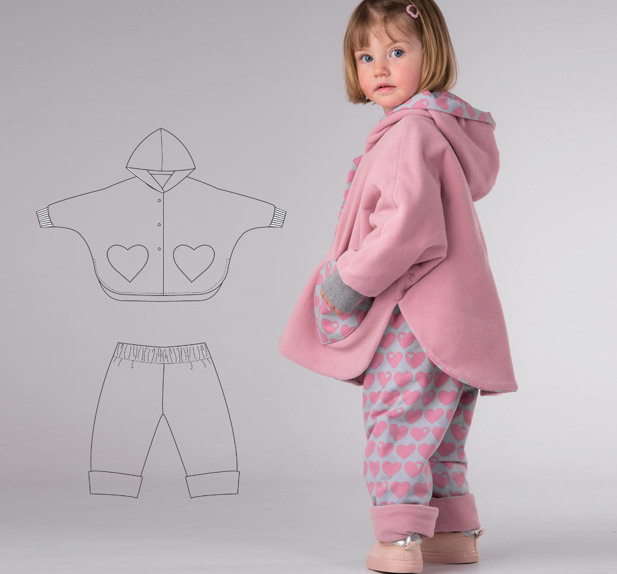 Mit dem MARA + FIOCCO Set nähst du einen wendbaren Poncho mit Kapuze und eine gefütterte Hose mit elastischem Bund – ideal für Mädchen und Jungen. Ob mit herzförmiger Tasche oder klassischer Eingrifftasche, du hast sofort zwei Looks zur Hand!