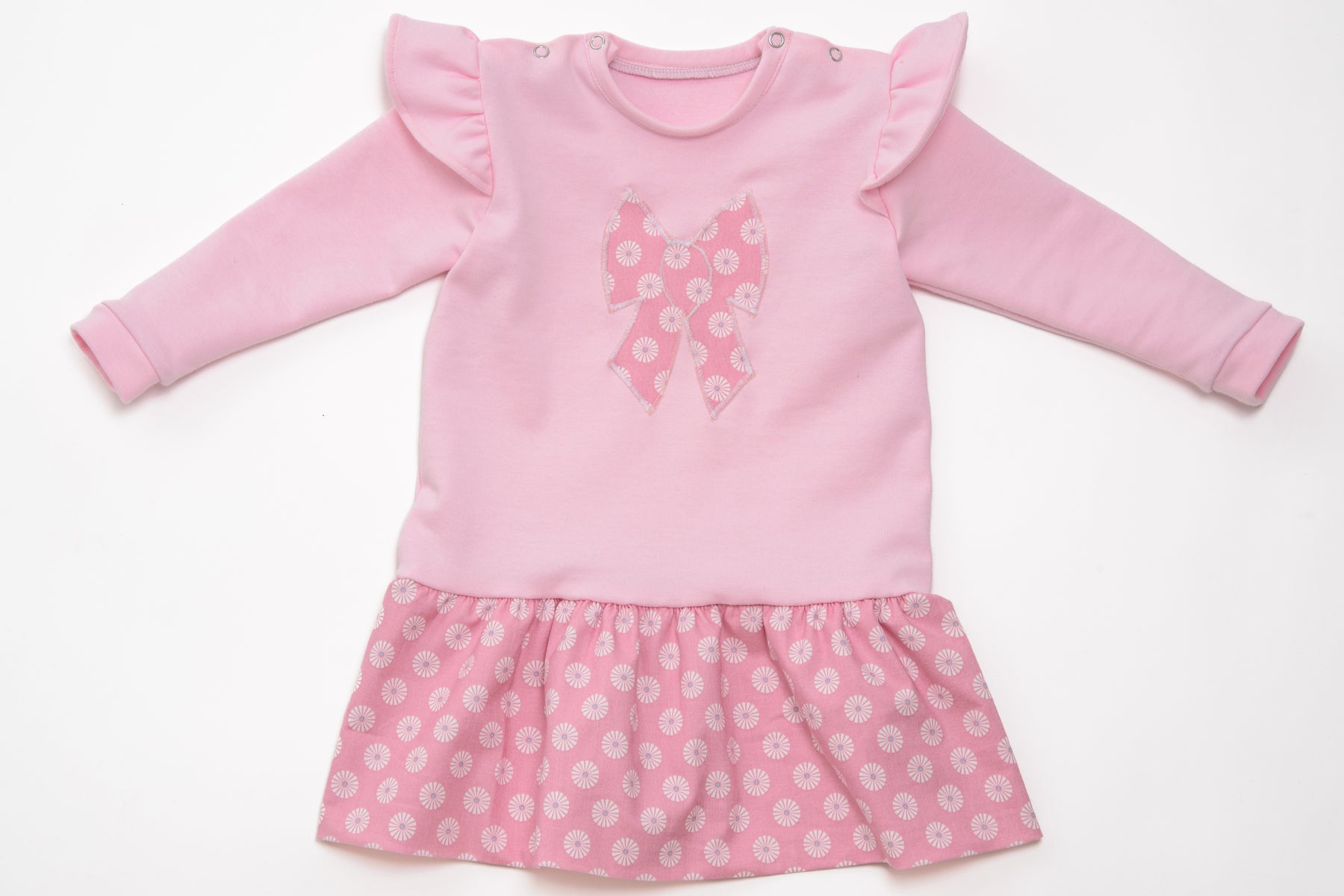 Schnittmuster Baby Sweatshirt mit Rüschen, rosa Blumenmuster und Schulterdruckknöpfen für Mädchen.