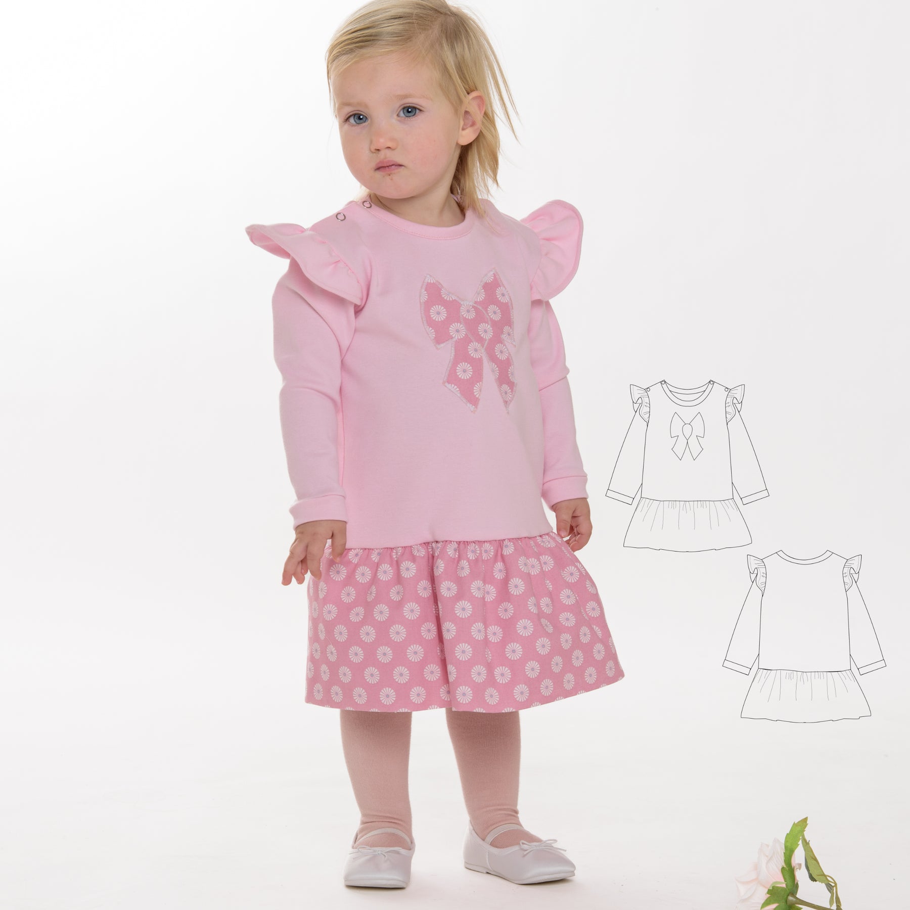 PDF Schnittmuster Download – Baby Mädchen Kleidung – Kleid & Sweatshirt Set – Mehrere Größen – Rüschen-Schulter & Pinafore-Option – Digitaler Nähleitfaden