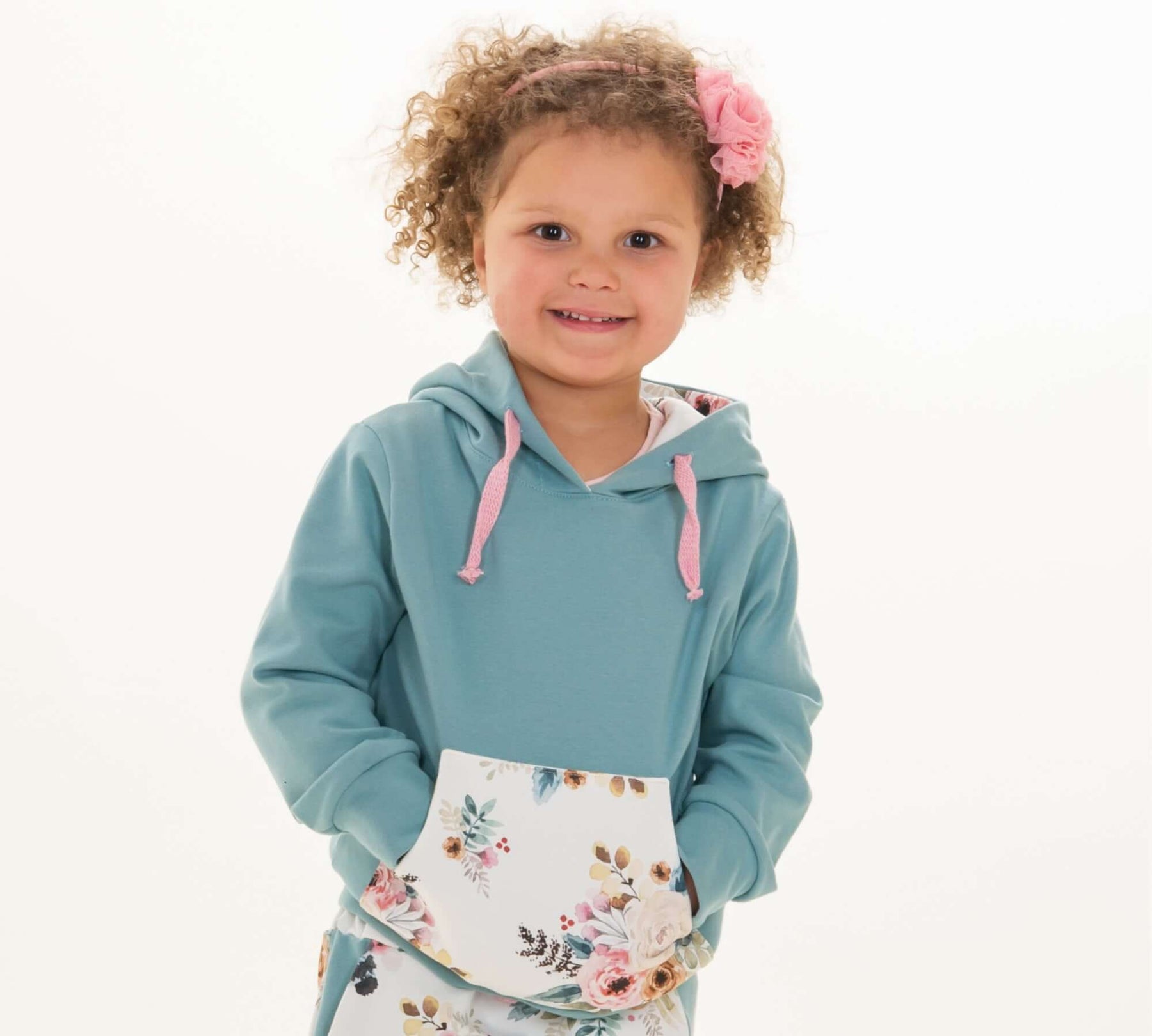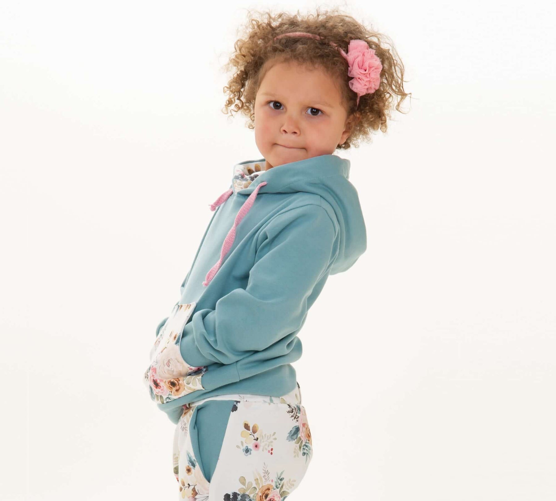 Kinder-Hoodie nähen: bequem, warm und vielseitig. Je nach Stoffwahl passt FLY in jede Jahreszeit. Die gefütterte Kapuze schützt vor Wind, die Schalkragen-Variante sorgt für einen modernen Look – beide mit Känguru-Tasche.